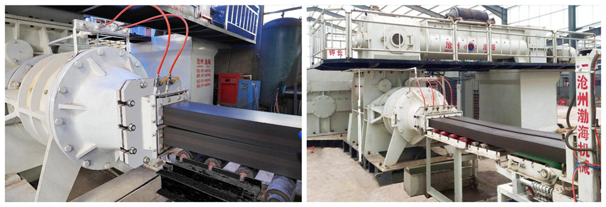 1, vacuum extruder by double mixing extrusion parts (upper) and extrusion molding (lower), and equipped with air compressor system and vacuum system. Adopts pneumatic clutch to implement remote control.